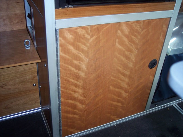 Bottom section below the refrigerator has a 25 1/2" tall x 23" wide door and is divided into three parts. The 4" deep 12 volt DC distribution electrical is on the left side. The electrical is accessed by removing a 7/32" cherry plywood wall panel on side of the cabinet. The right side is divided by a shelf. Behind the shelf between the shelf and the van wall is the 4" square floor hole vent. Floor vent is screened and has a plywood cover that can be opened or closed with a lawn mower engine pull cord. When cord is pulled handle can be hooked on a aluminum tab so vent remains open. Pull handle off the tab and gravity closes the vent.
